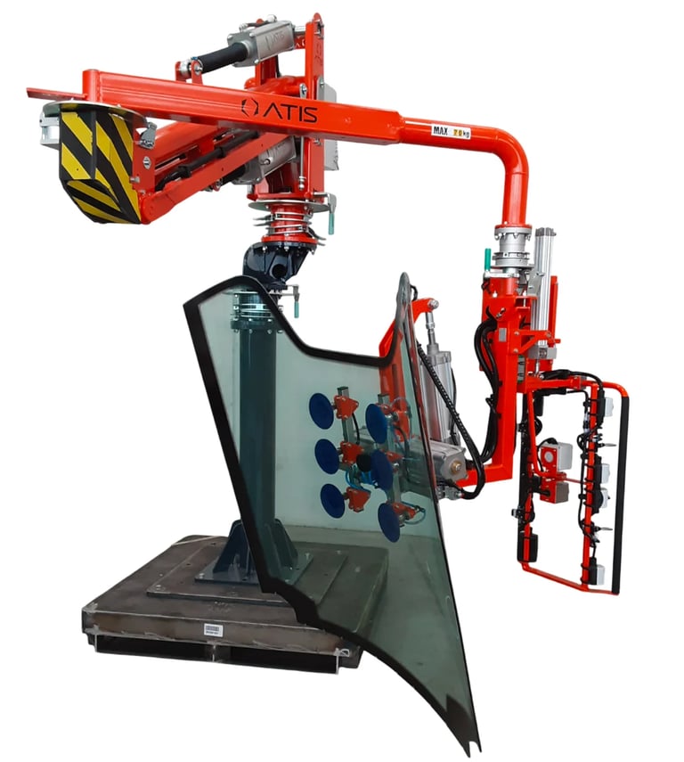 Industrial manipulators allow operators to move glass panels with controlled precision while maintaining ergonomic working conditions.