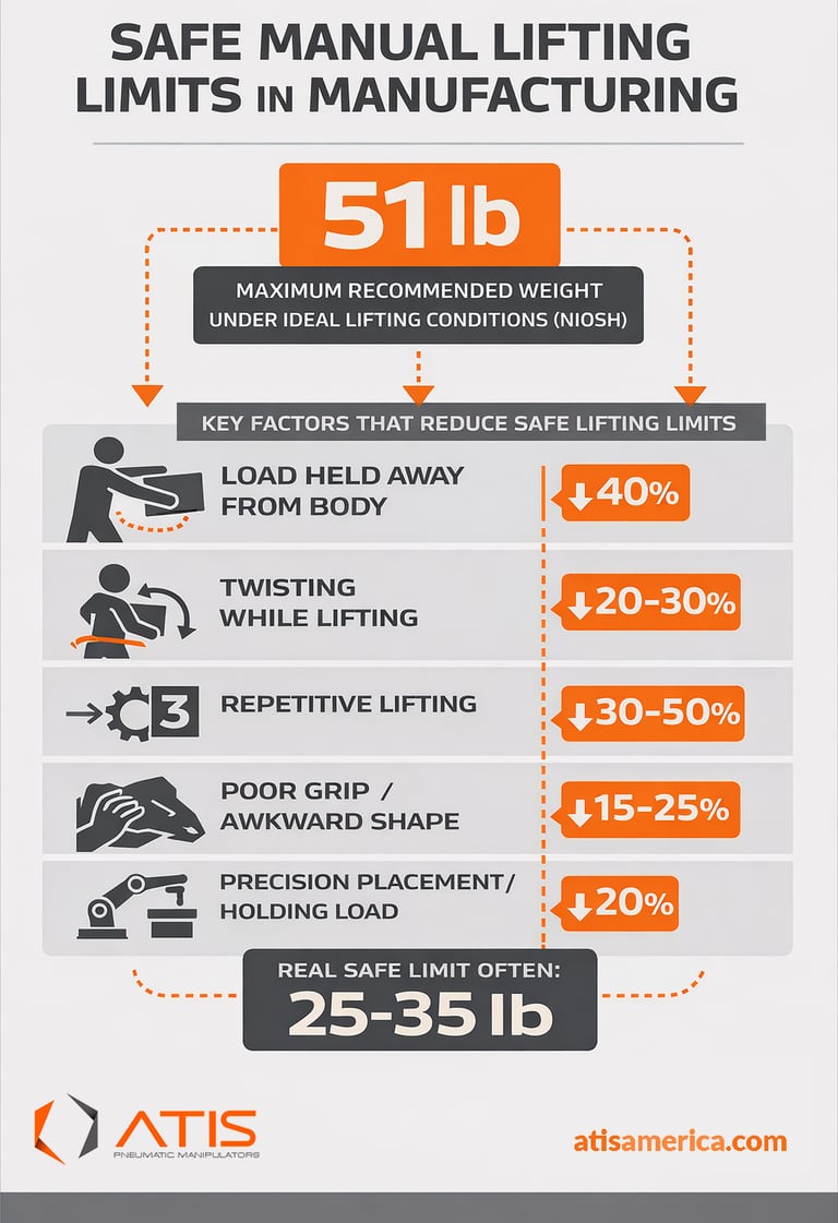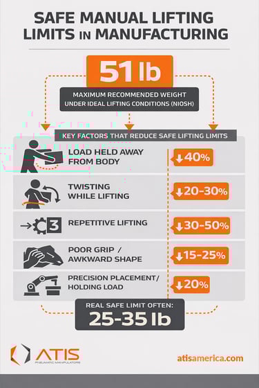 Under ideal conditions, the equation produces a recommended weight limit of about 51 pounds. But those ideal conditions rarely exist on a production floor. As soon as operators must reach forward, twist, lift repeatedly, or handle awkward components, the recommended safe lifting weight can drop significantly. This is one reason many manufacturers begin exploring ergonomic material handling systems when repetitive lifting becomes part of daily production.